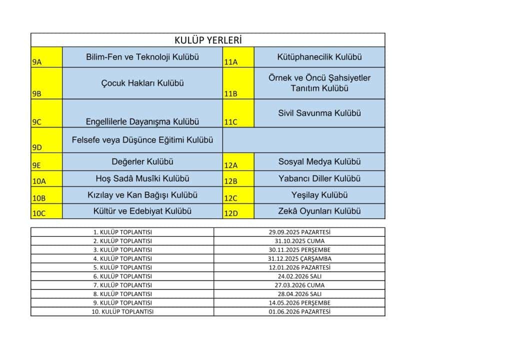 2025-2026 Sosyal Etkinlik Kulüpleri Yerleri ve Tarihleri