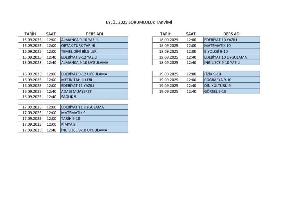 2025 EYLÜL AYI SORUMLULUK TAKVİMİ VE ÖĞRENCİ LİSTESİ